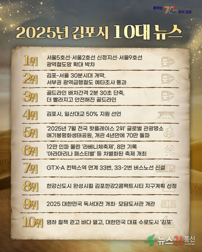 김포시는 지난 11월 7일부터 24일까지 네이버 설문조사 폼을 통해 교통, 교육, 문화, 복지, 관광 등 다양한 분야 20개 정책을 대상으로 ‘2025년 김포시 10대 뉴스’ 온라인 투표를 실시했다. 올해 10대 뉴스는 총 218명의 시민이 참여해 후보 21개 중 최대 5개까지 중복 선택하는 방식으로 선정됐다.