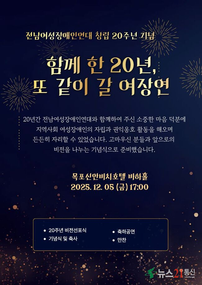 [뉴스21 통신=박민창 ] (사)전남여성장애인연대(대표 문애준, 이하 전남여장연)가 오는 12월 5일 창립 20주년을 맞아 목포 신안비치호텔에서 기념식을 개최한다.