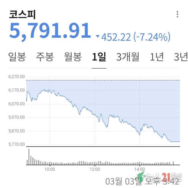 [속보] 코스피, 5900 이어 5800선 붕괴…7%대 폭락