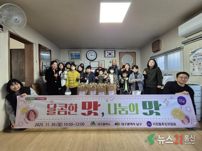 (뉴스21통신) 권혜선기자 = 대구 남구 이천동 우리마을 교육나눔 추진위원회는 “지난 11월 30일, 이천동행정복지센터에서 이천동 추진위원회주관으로 청소년과 주민 등 30여 명이 참여한 ‘달콤한 맛, 나눔의 맛’ 프로그램을 진행했다. 체험에 참여한 청소년들은 직접 만든 떡을 들고 마을 내 경로당을 방문하여 어르신들에게 따뜻한 마음을 전하며, 세대 간 정을 나누는 뜻깊은 나눔을 실천했다.
