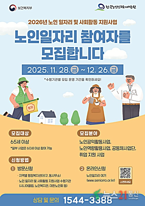 의성군(군수 김주수)은 지역 어르신들의 건강한 노후생활과 안정적 소득 활동을 지원하기 위해 12월 9일부터 16일까지 ‘2026년 노인일자리사업’참여자 2,706명을 모집한다고 밝혔다.