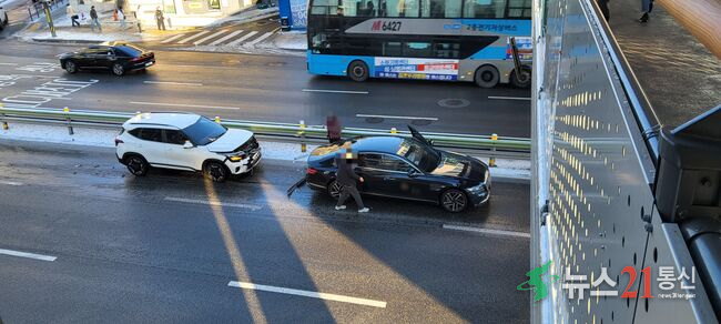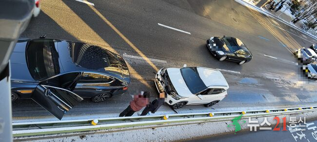 당시 도로상태는 어제 내린 눈으로 인해 미끄러운 상태였으며,편도 3차선중 1차선상에서 검정색 승용차를 뒤쪽에서 흰색 SUV차량이 추돌한 것으로 보인다.