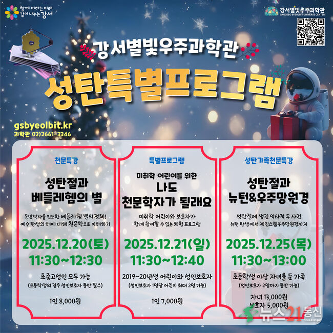 서울 강서구(구청장 진교훈) 강서별빛우주과학관(금낭화로 178)은 연말과 성탄절을 맞아 다채로운 천문 프로그램을 운영한다.