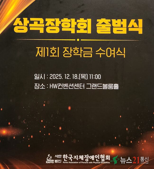 (사)한국지체장애인협회가 장애 학생들의 교육 기회 확대와 미래 인재 양성을 위한 새로운 발걸음을 내디뎠다. ''상곡장학회 출범식 및 제1회 장학금 수여식'**이 2025년 12월 18일(목) 오전 11시, HW컨벤션센터 그랜드볼룸홀에서 성황리에 개최됐다.이날 행사에는 협회 관계자와 장학생, 학부모, 내빈 등 다수가 참석해 상곡장학회의 뜻.