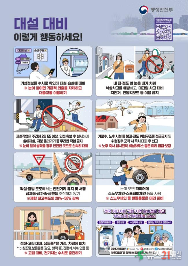 시는 시민들에게 ▲대중교통 이용 및 감속 운전 ▲내 집·점포 앞 눈 치우기 ▲비닐하우스·임시천막 등 노후 시설물 점검·보강 등 겨울철 대설 행동 요령을 안내하며, 최신 기상정보와 안전안내문자를 수시로 확인해 줄 것을 당부했다.