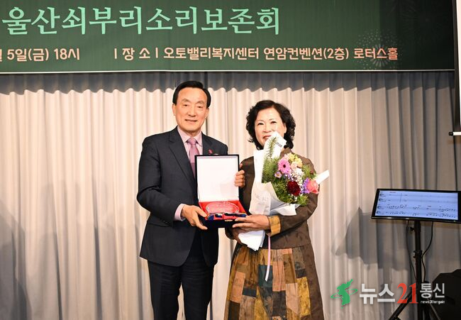 박천동 북구청장이 5일 연암컨벤션에서 열린 울산쇠부리소리보존회 송년회에서 무형유산의 전승과 보전에 헌신한 유공자에게 표창패를 수여한 뒤 기념촬영을 하고 있다.