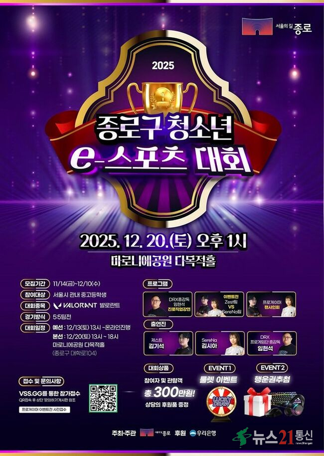 서울시 관내 중˙고등학생을 위한 대규모 e-스포츠 축제가 연말을 뜨겁게 달굴 예정이다.오는 12월 20일(토) 오후 1시, 마로니에공원 다목적홀에서 펼쳐지는 **'2025 종로구 청소년 e-스포츠 대회'**가 그 주인공이다. 이번 대회는 청소년들이 건전한 게임 문화 속에서 협동심과 경쟁심을 기를 수 있도록 마련된 행사로, 예선은 12월 13일(토) ~...