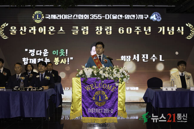 [뉴스21 통신=최세영 ]▲ 사진제공=울산라이온스클럽2025년 12월 11일(목) 오후 6시 30분, 울산 보람컨벤션 3층에서 울산라이온스클럽 창립 60주년 기념식이 성대하게 개최됐다. 이번 행사에는 지역사회 인사뿐 아니라 울산 무궁화라이온스클럽을 포함한 30개 라이온스클럽의 회장단과 라이온들이 참석해 울산라이온스클럽의 60년 역사를 함께 축...