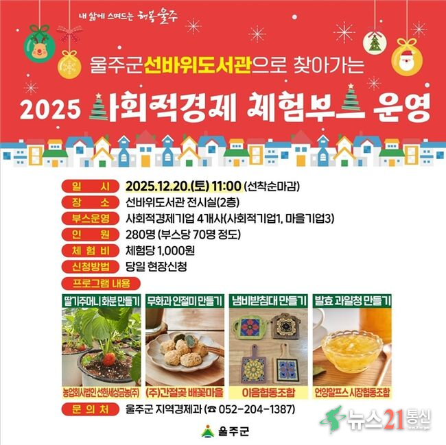 울산 울주군이 오는 20일 선바위도서관 2층 전시실에서 ‘선바위도서관으로 찾아가는 사회적경제 체험부스’를 운영한다고 12일 밝혔다.
