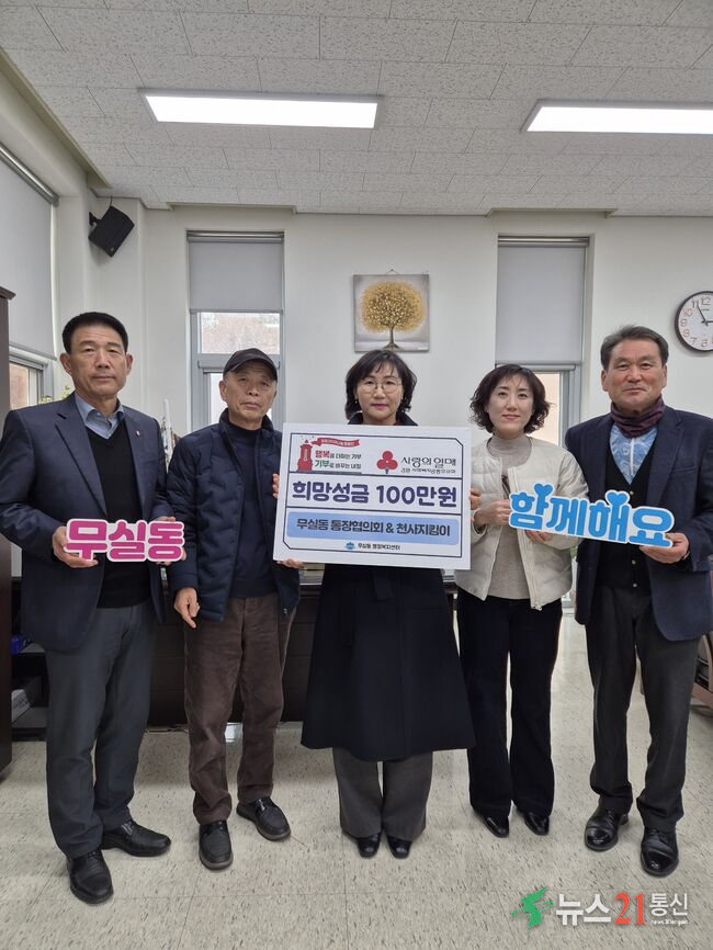 원주시 무실동 통장협의회(회장 김동찬)와 천사지킴이(회장 이태균)는 지난 12일 무실동 행정복지센터를 방문해 희망2026 나눔캠페인 성금 100만 원을 전달했다.성금은 사회복지공동모금회를 통해 관내 취약계층과 복지가구에 전달될 예정이다.김동찬 통장협의회장은 “통장협의회와 천사지킴이가 십시일반 모은 따뜻한 정성이 우..
