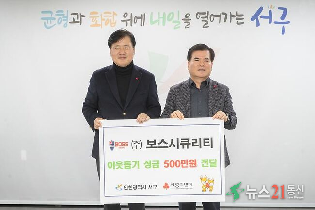 인천 서구(구청장 강범석)는 지난 15일 보스시큐리티(주)(대표 공병석)로부터 이웃돕기 성금 500만 원을 전달받았다.