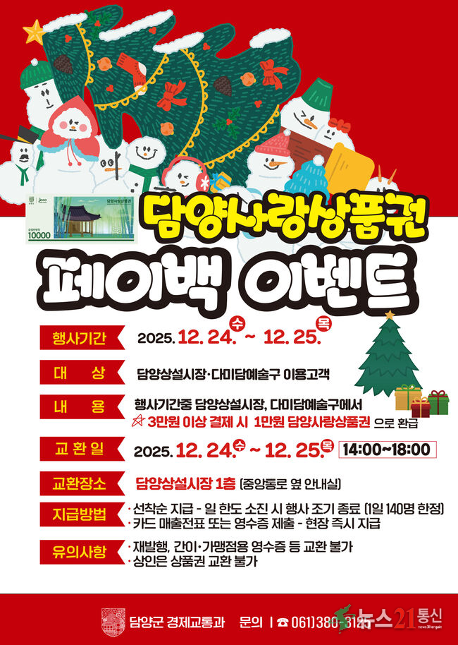 담양군(군수 정철원)이 연말 소비 진작과 지역경제 활성화를 위해 12월 23일부터 25일까지 담양읍 중앙로와 담양시장 일원에서 ‘담양사랑상품권 페이백 행사’를 운영한다.