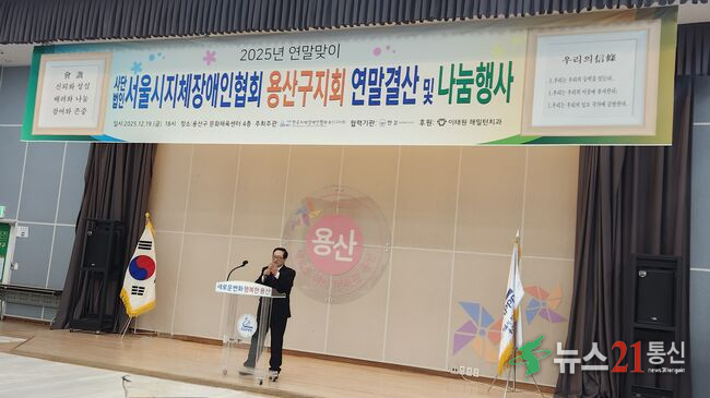 사단법인 서울시지체장애인협회 용산구지회(회장 김상근)는 12월 19일(금) 오후 6시, 용산구 문화센터 4층 대강당에서 **'2025년 연말맞이 연말결산 및 나눔행사'**를 성황리에 개최했다.이날 행사는 한 해 동안의 활동을 돌아보고, 장애인 당사자와 지역사회가 함께하는 화합과 나눔의 의미를 되새기는 뜻깊은 자리로 마련됐으며, 장애인 ...