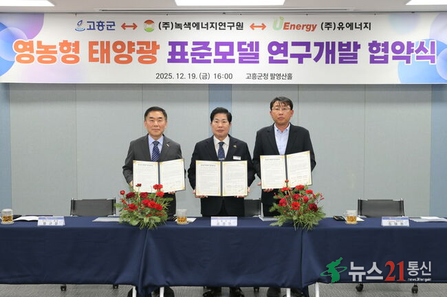 고흥군은 12월 19일 군청에서 (재)녹색에너지연구원, ㈜유에너지와 업무협약을 체결하고 ‘고흥형 영농형 태양광 표준모델’ 연구개발을 본격 추진한다고 밝혔다.