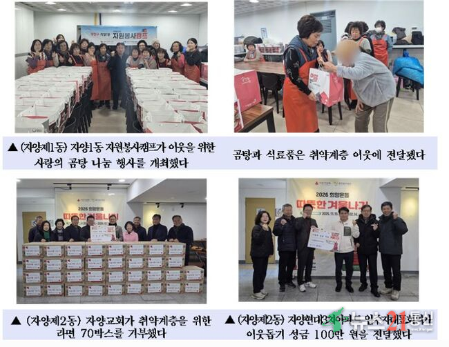 자양2동 주민센터는 12월 12일 자양교회로부터 라면 70박스를 기부받고, 15일에는 자양현대3차아파트 입주자대표회의에서 성금 100만 원을 전달받았다.