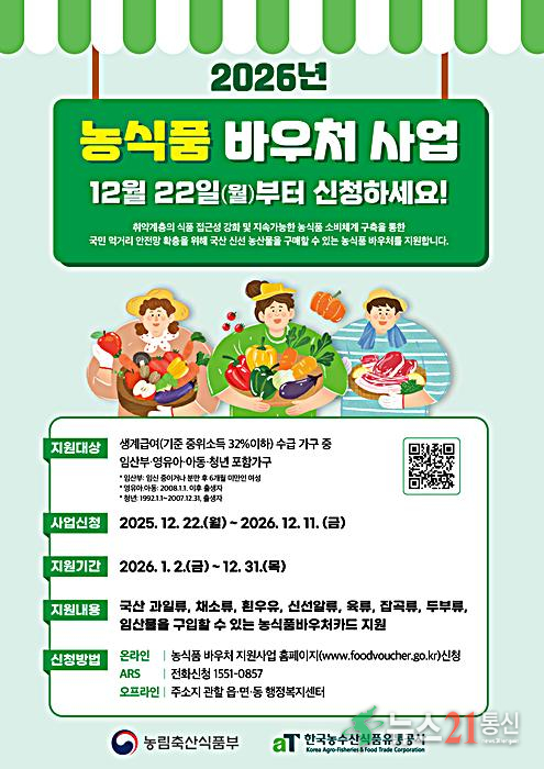 경북도는 22일부터 생계급여 수급 가구에 온라인, 읍면동 행정복지센터 방문, ARS 전화로 2026년도 농식품바우처 카드 발급을 시작한다.