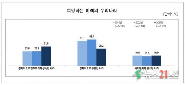 '한국인의 의식·가치관 조사'에서 국민이 희망하는 우리나라 미래상에 대해 '민주주의가 성숙한 나라'가 처음으로 '경제적으로 부유한 나라'를 처음으로 앞질렀다.
