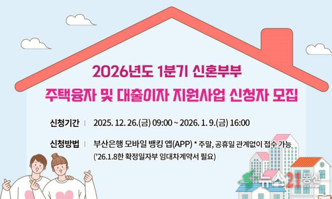 부산시는 내년 1분기 「신혼부부 주택융자 및 대출이자 지원사업」 대상자를 12월 26일부터 2026년 1월 9일까지 모집한다고 밝혔다.