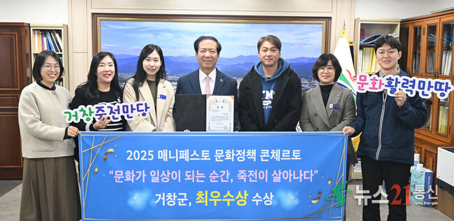 [뉴스21 통신=김희백 사회2부기자] 거창군은 강원특별자치도 원주시 상지대학교에서 개최한 ‘2025 전국 기초단체장 매니페스토 문화정책 콘체르토(Concerto)’ 대회에서 문화기반 도시활력분야 ‘최우수상’을 수상했다고 26일 밝혔다.