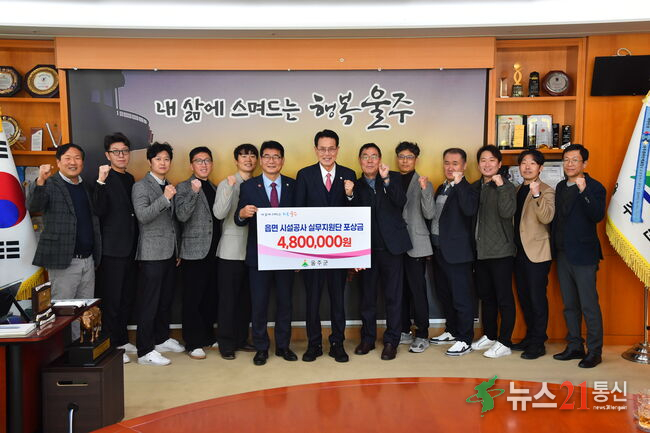 울산 울주군이 26일 군청 소회의실에서 읍면 시설공사 실무지원단 12명에게 포상금을 지급한 가운데 이순걸 군수와 윤덕중 부군수 및 실무지원단 등 참석자들이 포상금 전달식을 가진 뒤 기념촬영을 하고 있다.