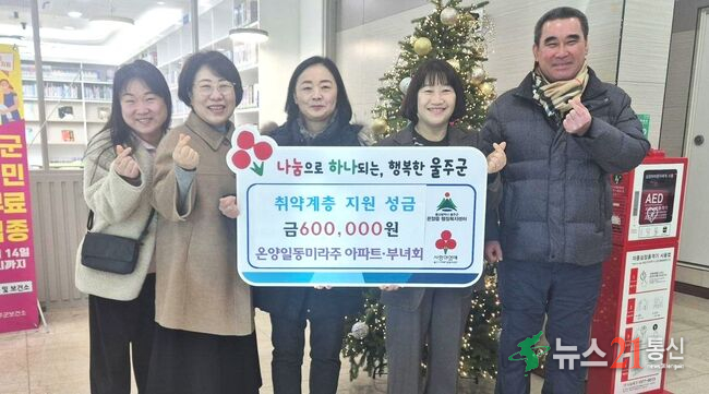 온양일동미라주아파트(입주자 대표 박정열)와 부녀회(회장 김윤경)가 26일 울주군 온양읍 행정복지센터에 지역 취약계층을 위한 성금 60만원을 전달했다.