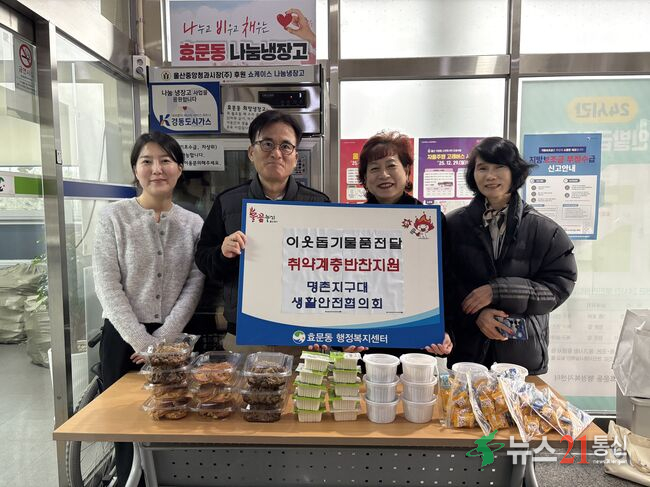 북구 명촌지구대 생활안전협의회는 26일 북구 효문동 나눔냉장고에서 직접 만든 반찬과 식료품을 기부했다.