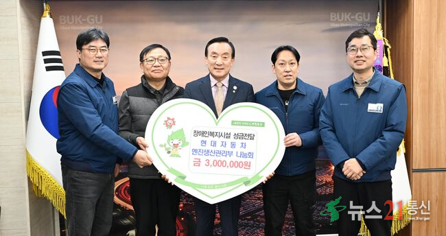 현대자동차 엔진생산관리부 나눔회는 26일 북구청장실에서 아나율장애인보호작업장 후원에 써 달라며 성금 300만원을 박천동 북구청장에게 전달했다.