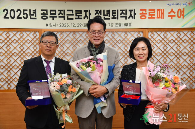 울산 울주군이 29일 오전 군청 은행나무홀에서 2025년 공무직 정년퇴직자 공로패 수여식을 개최한 가운데 이순걸 군수가 공로패를 전달한 뒤 관계자들과 기념촬영을 하고 있다.