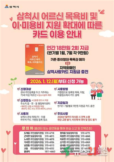 삼척시는 어르신들의 위생 관리와 건강 증진을 위해 기존 목욕비 지원사업을 확대하고, 2026년부터 목욕비와 이미용비를 포함한 통합 지원사업을 시행한다고 밝혔다.
