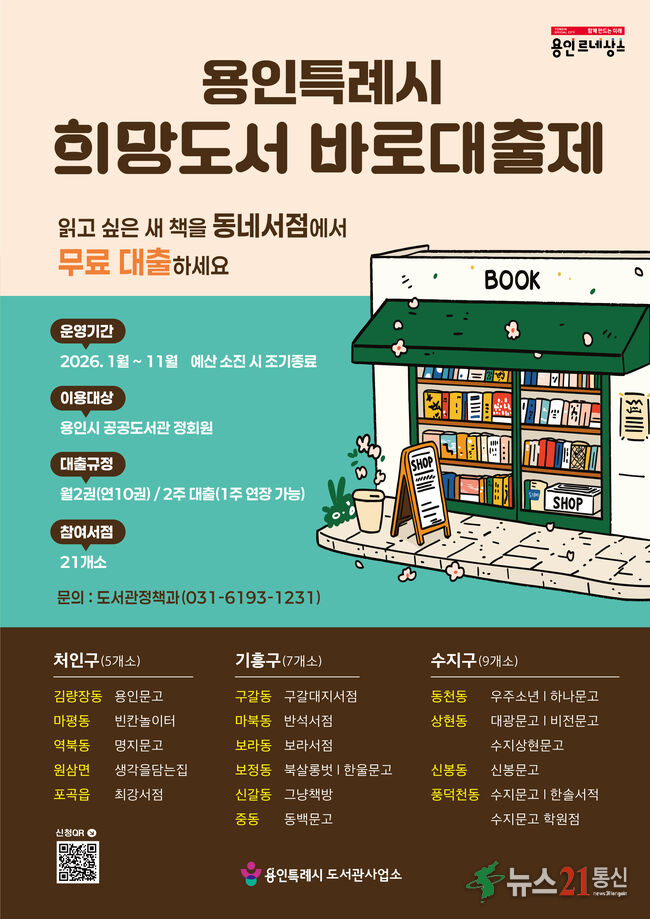 대출 기간은 14일이며 1회 7일 연장 가능하다. 이용 후 반납된 책은 도서관이 구매해 장서로 등록한다. 처인·기흥·수지구 총 21개 서점이 참여하며, 시민의 독서 접근성 향상과 이용자 중심 환경 조성에 기여할 것으로 기대된다.