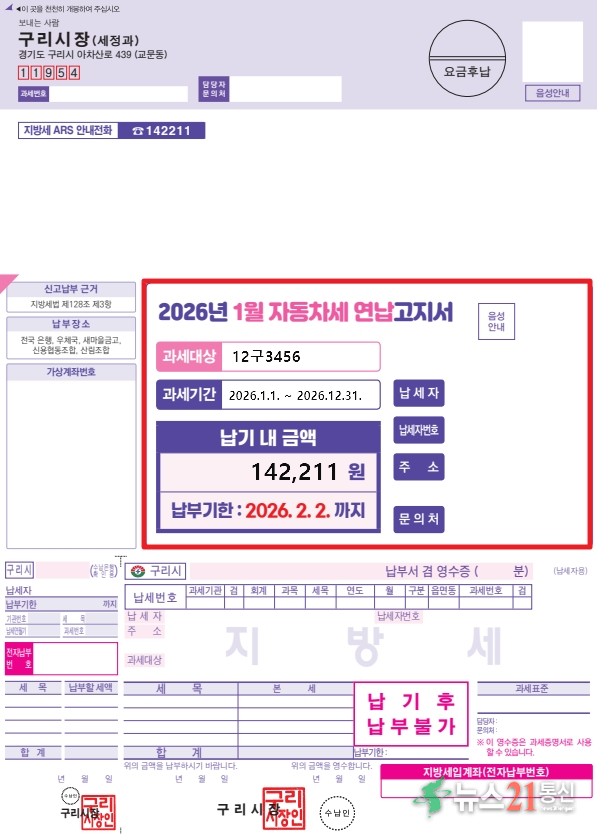 새롭게 도입되는 ‘큰 글씨 고지서’는 오는 1월 자동차세(연납)와 등록면허세 고지서를 시작으로, 주민세 정기분 및 독촉분 고지서에도 순차적으로 적용될 예정이다.
