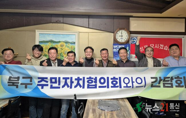 김상태 울산북구의회의장이 29일 저녁 북구 양정동 관내 식당에서 8개동 전체 주민자치협의회 회장들이 참가한 가운데 간담회를 갖고 지역 현안 해결에 힘을 모으기로 다짐했다.