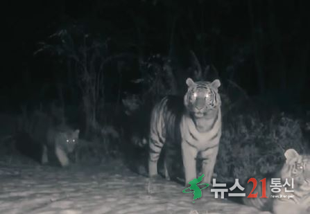 100년 전 한반도에서 사라진 백두산 호랑이가 중국에서 새끼 5마리와 어미와 함께 카메라에 포착됐다.