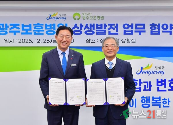 장성군이 지난 26일 광주보훈병원과 군민 건강 증진 및 지역 발전을 위한 업무협약을 맺었다. 김한종 장성군수, 이삼용 광주보훈병원 원장 등 관계자 10여 명이 함께했다.