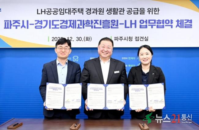[뉴스21 통신=추현욱 ]파주시는 지난 30일 경기도경제과학진흥원, 한국토지주택공사(LH) 경기북부지역본부와 경과원 파주시 이전에 따른 LH공공임대주택 생활관 지원을 위한 업무협약을 체결했다