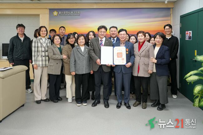 김상태 울산북구의회 의장이 31일 의장실에서 퇴직공무원인 최상규 전 의회사무과장에 대한 정부 녹조근정훈장을 전수했다.