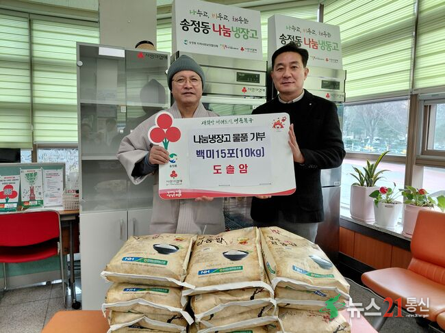 도솔암은 31일 북구 송정동 행정복지센터를 찾아 50만원 상당의 10kg 쌀 15포를 이웃돕기 성품으로 전달했다.