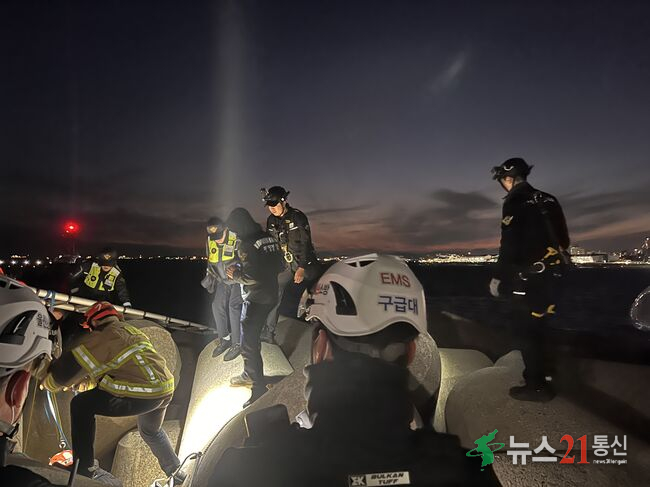 신고를 받고 즉시 출동한 해경과 소방, 경찰은 합동 구조 작업을 펼쳐 사고 발생 약 35분 만인 오후 6시 10분경 A씨를 구조했다. 사고 지점은 테트라포드 사이 약 5.5m~6m 깊이의 가파른 지점으로 구조에 어려움이 있었으나, 유관기관의 긴밀한 협력으로 신속한 인명이 구조될 수 있었다.