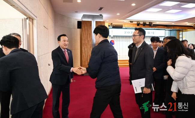 박천동 북구청장이 2일 2026년 시무식 후 직원들과 신년인사를 나누고 있다.