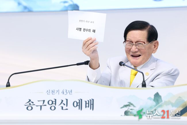 이만희 총회장은 지난 1일 신천지 영등포교회에서 열린 송구영신 예배를 인도하며 ‘붉은 말의 해’인 2026년의 표어를 ‘사명 완수의 해’로 발표했다. 아울러 요한계시록에 기록된 신앙인의 사명을 증거하고 이 사명을 이루는 해로 만들자고 주문했다.