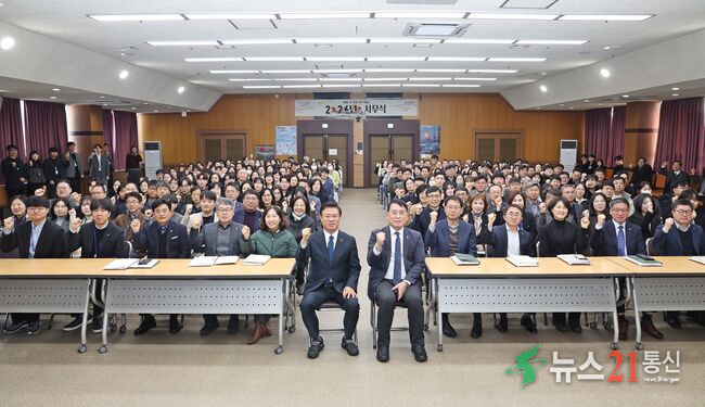 2일 이학수 정읍시장과 직원들이 시무식을 갖고 기념 촬영을 하고있다.[정읍시 제공]