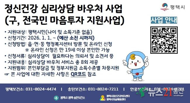 평택시(시장 정장선)에서는 시민의 마음 건강을 지키고 자살 예방 및 정신질환 조기 발견을 돕기 위한 ‘정신건강 심리상담 바우처사업’을 2026년에도 계속 추진한다.