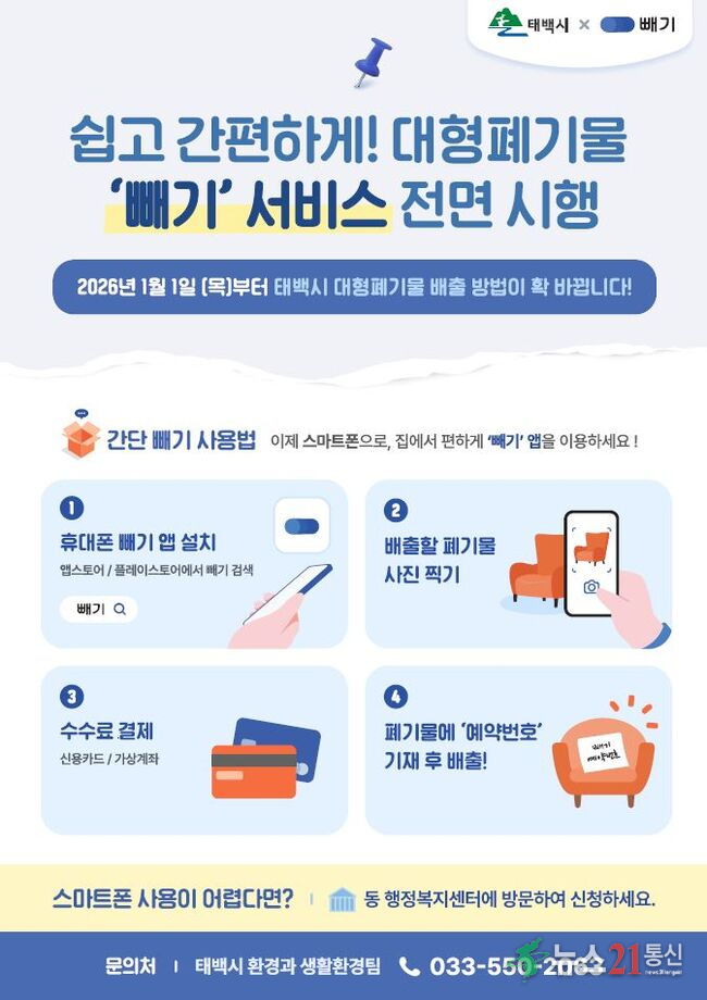 태백시는 2026년 1월 1일부터 대형폐기물 배출 신청, 수수료 결제, 처리 결과 확인까지 스마트폰 앱 ‘빼기’를 통해 원스톱으로 처리할 수 있는 서비스를 시행했다.