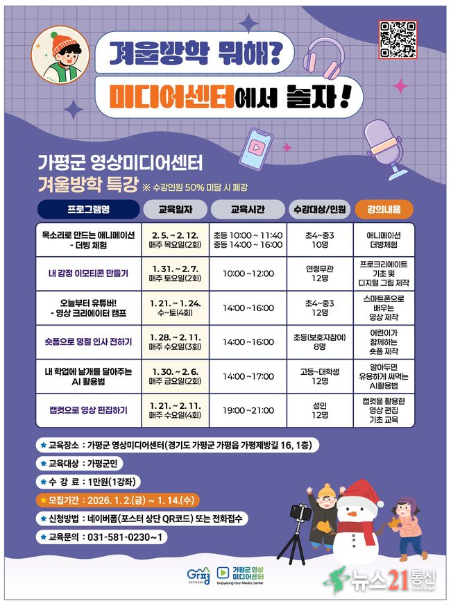 가평군 영상미디어센터는 겨울방학을 맞아 지역 학생들을 위한 ‘겨울방학 특강 프로그램’을 운영한다고 9일 밝혔다. 프로그램은 애니메이션 더빙, 영상 크리에이터 캠프, AI 활용법, 영상 편집 등 다양한 주제로 구성되며, 초등학생부터 중·고등학생까지 참여할 수 있다. 일부 강좌는 보호자 참여형으로 가족 단위 수업도 진행된다.