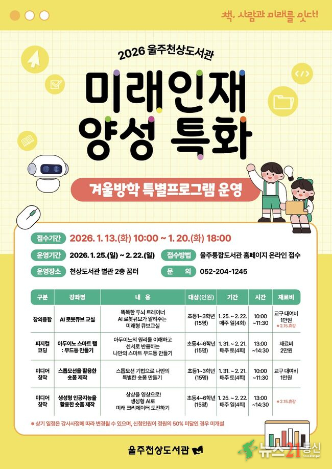▲사진제공:울주군청 울주천상도서관이 겨울방학을 맞아 오는 25일부터 다음달 22일까지 초등학생을 대상으로 ‘미래인재 양성 특화, 겨울방학 특별프로그램’을 운영한다고 13일 밝혔다.이번 특별프로그램은 아이들의 호기심과 상상력을 자극하는 다채로운 활동으로 마련됐다. 참여 어린이들이 놀이처럼 즐겁게 몰입하면서 자연스..