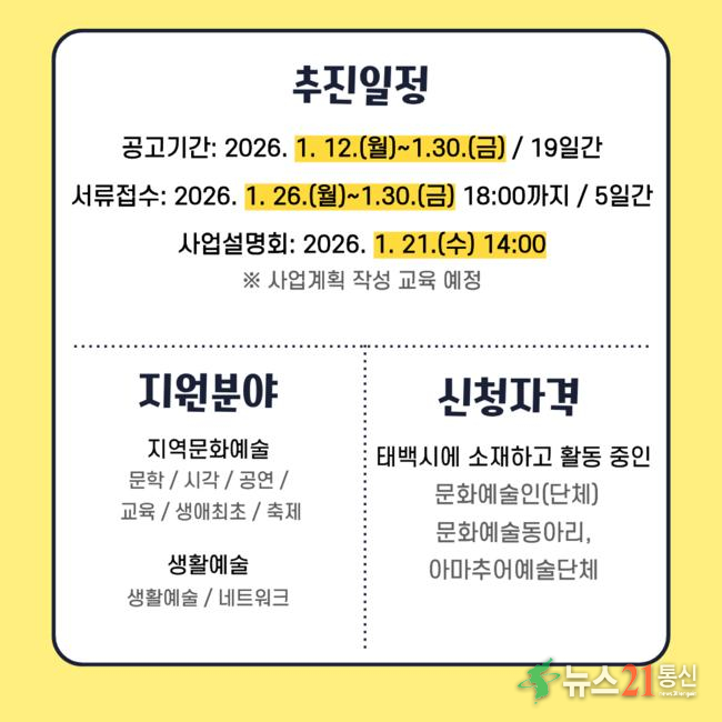 이번 공모는 태백시에 소재한 문화예술인과 동아리, 아마추어 예술단체를 대상으로 하며, 문학, 시각, 공연, 교육, 축제, 생활예술, 네트워크 등 다양한 분야의 활동을 폭넓게 지원한다.