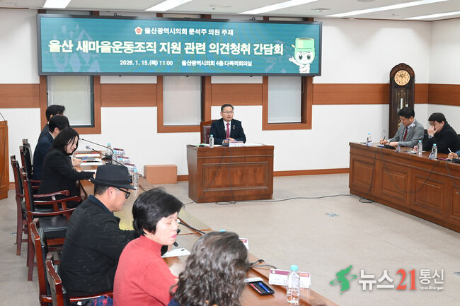 [뉴스21 통신=최세영 ] 울산광역시의회 문석주 의원(농소2동, 농소3동)은 15일 오전, 시의회 4층 다목적 회의실에서 울산 새마을운동 조직 지원 관련 의견청취 간담회를 개최했다. 이날 간담회에는 북구 새마을회(회장 정인락) 및 새마을협의회·부녀회 회장단, 시 자치행정과·인재교육과 관계 공무원 등 20명이 참석했다. 이...