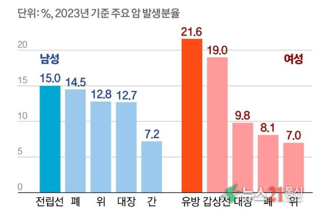 2023년 남녀 전체에서 가장 많이 발생한 암은 갑상선암이었고, 이어 폐암ㆍ대장암ㆍ유방암ㆍ위암ㆍ전립선암ㆍ간암 순이었다.