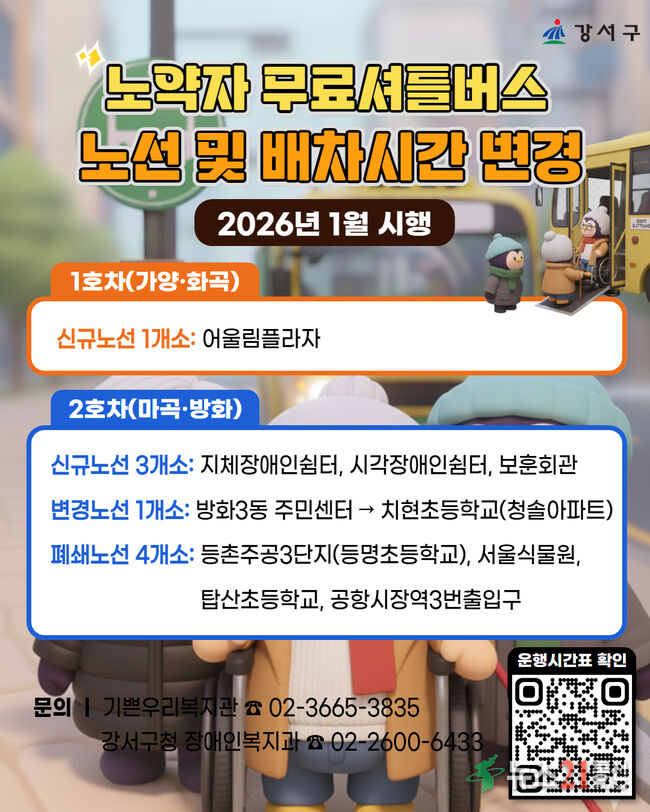 서울 강서구(구청장 진교훈)는 장애인과 어르신 등 교통약자의 이동 편의를 높이기 위해 ‘노약자 무료 셔틀버스’ 노선을 정비하고, 변경 운행에 들어갔다고 밝혔다.