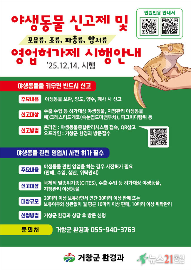 [뉴스21 통신=김희백 ] 거창군은 체계적인 야생동물 관리와 책임 강화를 위해「야생동물 신고제 및 영업허가제」를 본격 시행한다고 23일 밝혔다.